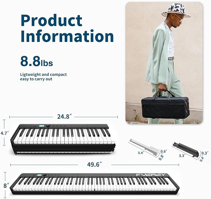 • ?【Ultra Portable Folding Piano】 Creative foldable portable design which can be folded in half, only weighs 8.8lb and measures 24.8inch in after folding. This electronic musical keyboard come with piano handbag, it is easier to carry and to transport, you can enjoy playing anywhere anytime, even if you just put it on the home, it doesn’t take up too much space.