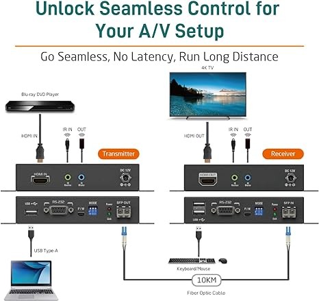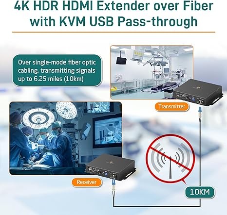 • ⚡【4K60 Over Fiber USB KVM Extender】Experience the ultimate solution for transmitting Ultra HD 4K60Hz video/audio signals over a single-mode fiber optic cable. With a remarkable transmission distance of up to 10KM(32,808ft), this extender supports HDMI 2.0, 4K60Hz 4:4:4 8 bits, HDR 4K60Hz 4:2:0 10bits, 7.1ch surround sound or stereo digital audio, HDCP 2.2, Bi-directional IR and RS-232 pass-through.