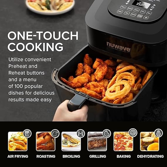 MAKE ADJUSTMENTS ON-THE-FLY – Want hotter temperature or need to cook it longer? No problem. Simply adjust on-the-fly. Starting the cooking process over is not necessary. Brio’s intuitive digital controls are easy to operate, and the response is immediate. Fit up to 3 pounds of French fries, 3 pounds of wings, or 5-pound chicken with ease. Brio’s cool white display is easy-to-read in any light or no light.