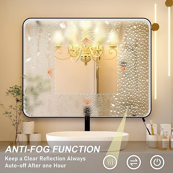 【Dimmable Anti-Fog LED Bathroom Mirror】Stepless dimming lighting bathroom mirror has 3 smart touch buttons, long press the ON/OFF switch to adjust the brightness. One-touch anti-fog and anti-fog switch with one-hour automatic shut-off function. The high-quality wall-mounted mirror is made of high-definition environmentally friendly copper-free glass, which has better oxidation resistance and durability and extends its service life.
