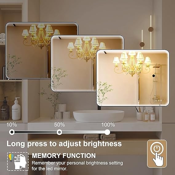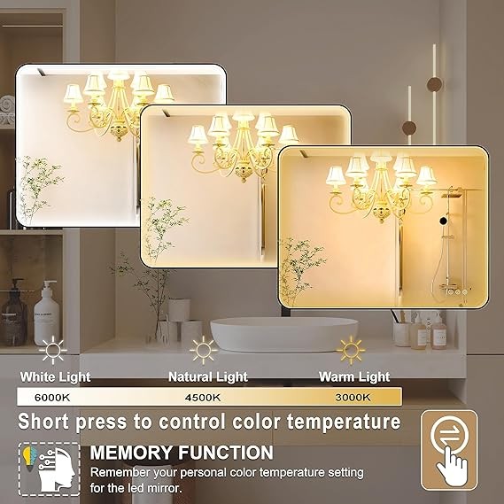【Upgraded Bathroom Mirror with 3-Color Side Light】The vanity mirror LED light strip is built into the frame, and the mirror light shines vertically on the mirror to make it look brighter. Short press the light button to adjust 3 color temperatures, warm light (3000K), natural light (4500K), and white light (6000K). The LED light mirror has a memory function that can remember your personal color temperature and brightness settings for the LED mirror.